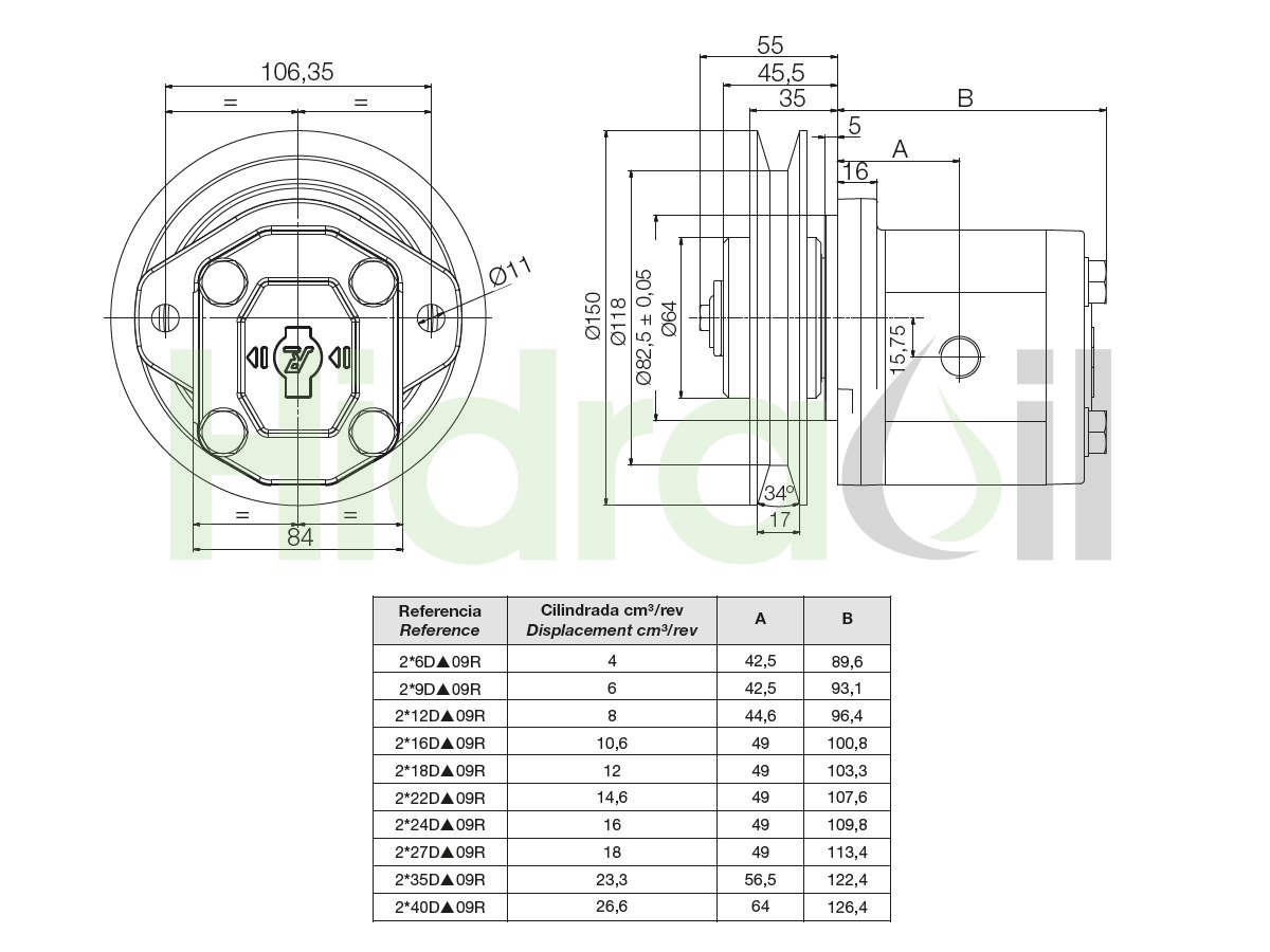Thumbnail of 2L16DP09R Roquet bomba hidráulica de engranajes 10.6 cc/rev con polea P brida 2 agujeros tomas roscadas giro a derechas